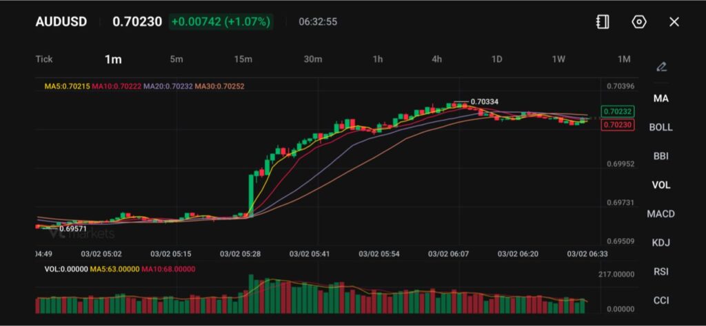 澳元兌美元匯率飆升至0.70230,漲幅達1.07%,上漲勢頭強勁,突破關鍵阻力位。此輪上漲行情一度觸及0.70334的高點,隨後略有回落,進入盤整階段。