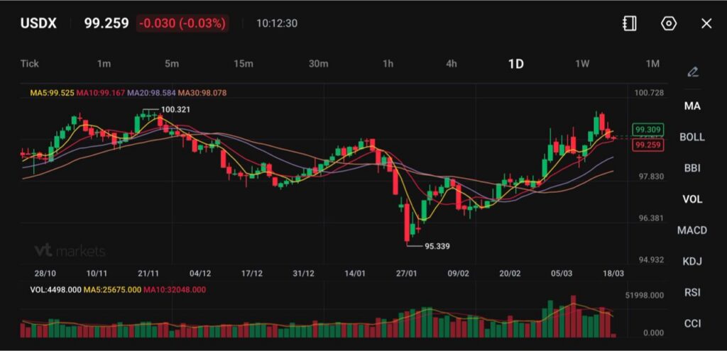 美元指數(US Dollar Index,USDX,衡量美元對一籃子主要貨幣的強弱)在約 99.26 附近,跌 -0.03%,連跌第 3 天。此前美元在上週大漲,創 10 個月新高,主要受地緣政治緊張與能源價格飆升帶動。