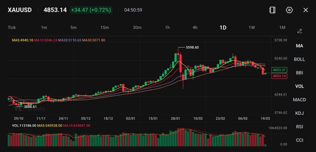 黃金(XAUUSD)在4,853附近交易,當日上漲約0.72%。價格試圖在先前自5,598高點回落(從高點往下修正)後出現小幅反彈。