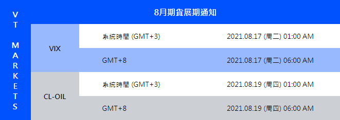 VT Markets 平臺的期貨產品:CL-OIL(原油期貨)、VIX(波動率指數)即將於以下時間展開新合約,如持倉過夜將會收取展期費用。