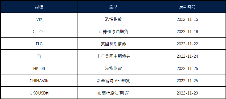 VT Markets 平台的期貨產品:CL-OIL (西德州原油期貨)、VIX (恐慌指數) 、CHINA50ft (新華富時A50期貨) 、HK50ft (港指期貨) 、UKOUSDft (布蘭特原油期貨) 、FLG(英國長期債券)、TY(十年美國中期債券)、即將於以下時間展開新合約,如持倉過夜將會收取展期費用。