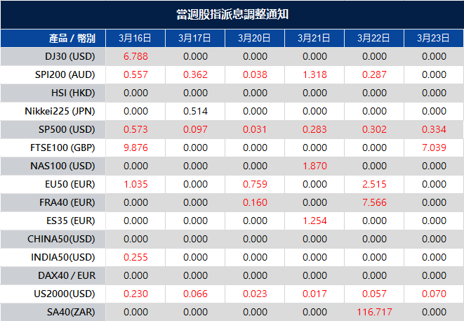 VT Markets 當週(3月16日 至 3月23日)隔夜倉息變化因此受到影響,具體調整內容如下: