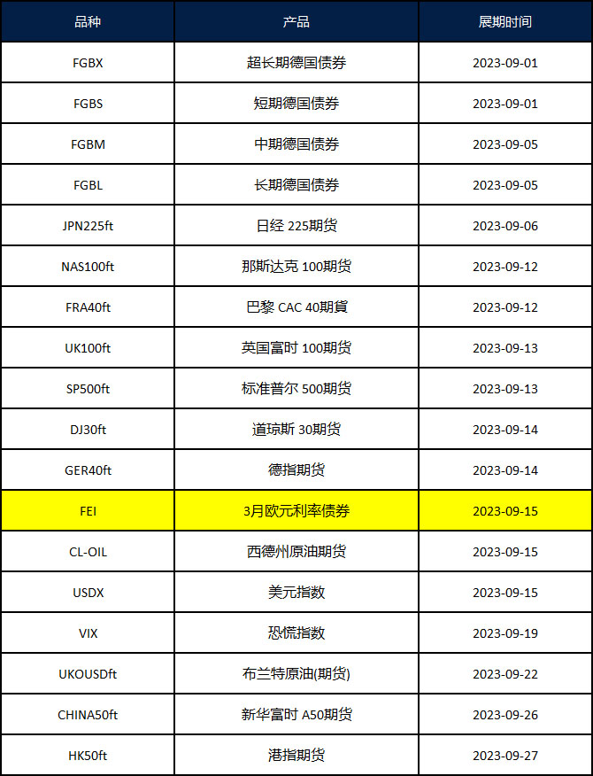 VT Markets 平台的期貨產品:FGBX (超長期德國債券) , FGBS (短期德國債券) , FGBM (中期德國債券) , FGBL (長期德國債券) , JPN225ft (日經 225期貨) , UK100ft (英國富時 100期貨) , NAS100ft (那斯達克 100期貨) , FRA40ft (巴黎 CAC 40期貨) , FEI (3月歐元利率債券) , SP500ft (標準普爾 500期貨) , DJ30ft (道瓊斯 30期貨) , GER40ft (德指期貨) , CL-OIL (西德州原油期貨) , USDX (美元指數) , VIX (恐慌指數) , UKOUSDft (布蘭特原油期貨) , CHINA50ft (新華富時 A50期貨) , HK50ft (港指期貨)) 即將於以下時間展開新合約,如持倉過夜將會收取展期費用。