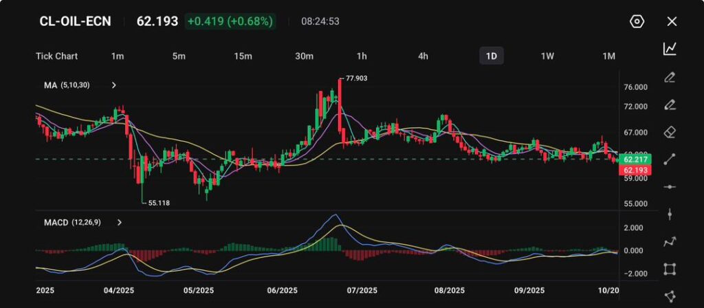 從技術面來看,油價仍處於盤整區間, 5日、10日和30日移動均線緊密聚集,反映出市場猶豫不決。支撐位繼續維持在59.00-60.00附近,該水平自9月中旬以來一直充當支撐位。任何跌破該區域的決定性跌幅,都可能引發進一步回調,跌向4月以來的55.00低點。