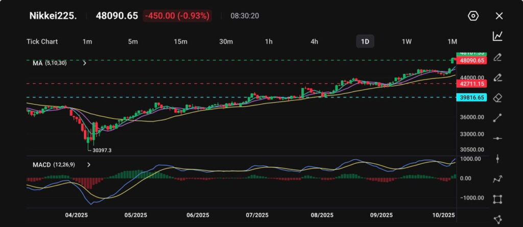 日經225指數報48,090.65點,當日下跌0.93% ,連續數週強勁上漲後有所回落。儘管今日有所回調,但該指數仍穩固地處於上升趨勢中,自4月份低點30,397.3點以來已飆升近60%。