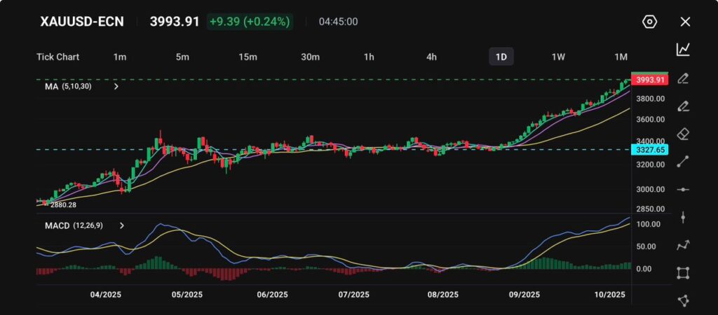 黃金( XAU/USD )延續強勁上漲勢頭,目前交易價格接近3,993.91美元,當日上漲0.24%,略低於4,000美元的關鍵心理關口。此次上漲標誌著自8月初以來強勁上漲趨勢的延續,自突破3,400-3,500美元阻力位以來,金價已上漲逾20%。
