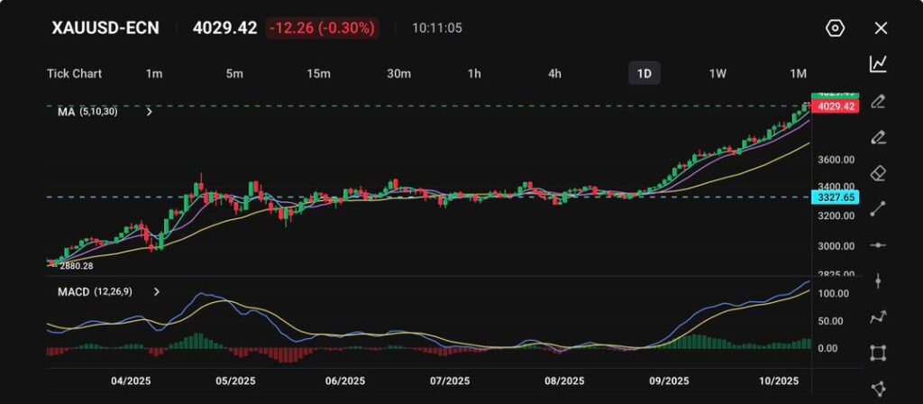 黃金(XAU/USD)交易價格約為4,029.42 美元,當日下跌0.30%,此前本週早些時候曾短暫觸及歷史新高。近期金價漲勢已顯露出降溫跡象,交易員在4,050-4,100 美元心理阻力位附近鎖定利潤。