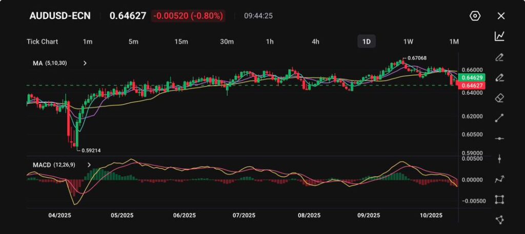 從技術面來看,澳元兌美元呈現明顯的看跌反轉走勢。該貨幣對已跌破所有關鍵移動平均線(5日、10日和30日),確認短期下行動能。