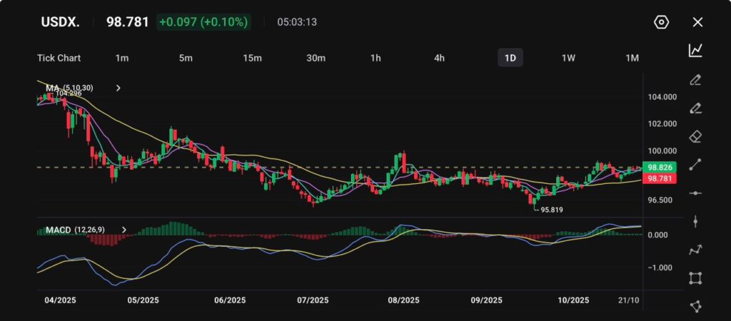 從技術面來看,該指數正從10月初低點95.82附近逐步回升,維持短期上行趨勢。