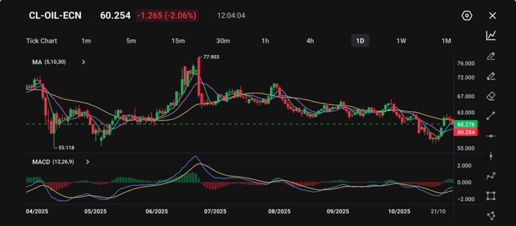 原油( WTI )週二延續回檔勢頭,下跌2.06%至60.25 美元,因全球數據好壞參半且庫存水準上升,交易商重新評估需求預期。