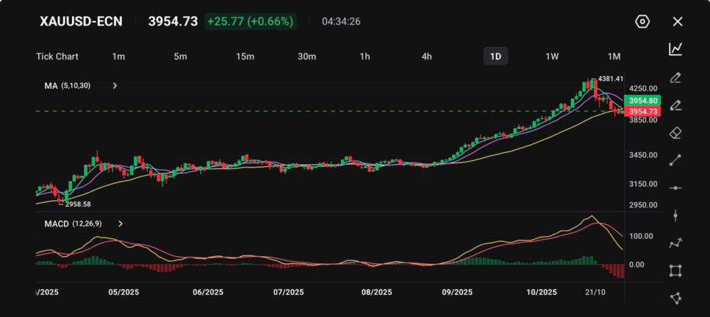 黃金( XAU/USD )小漲0.66%,至每盎司3,954.73美元,此前兩日金價大幅下跌,從4,380美元上方的歷史高點回落。這次反彈反映出交易員謹慎逢低買入,他們正在權衡美國貨幣政策預期的變化以及持續存在的全球風險,這些風險繼續支撐著避險需求。