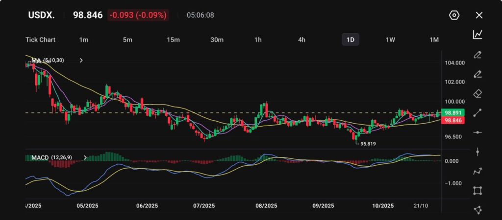 從技術面來看,美元在10月的低點95.82反彈後,仍處於橫盤整理階段。5日、10日和30日移動平均線在99.00水平下方收斂,顯示市場猶豫不決,缺乏明確的方向性動能。