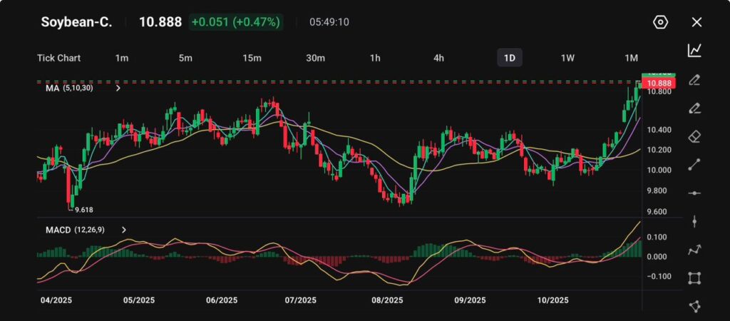 - 10月份大豆價格上漲超過10%,創下自2022年1月以來的最大月漲幅。