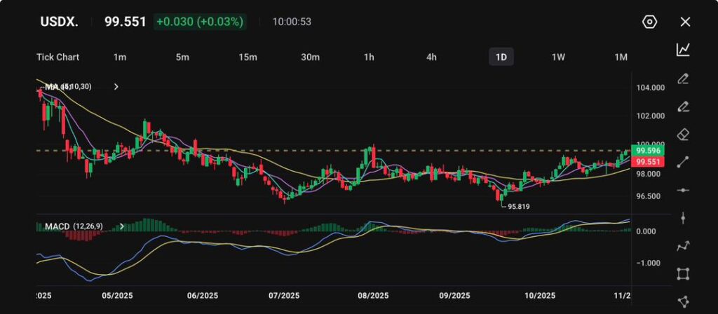 從技術層面來看,美元指數正試圖突破99.60的阻力位,短期移動平均線(5、10、30)都顯示出看漲跡象。 MACD指標已轉正,顯示在經歷了數週的橫盤整理後,市場動能正在增強。