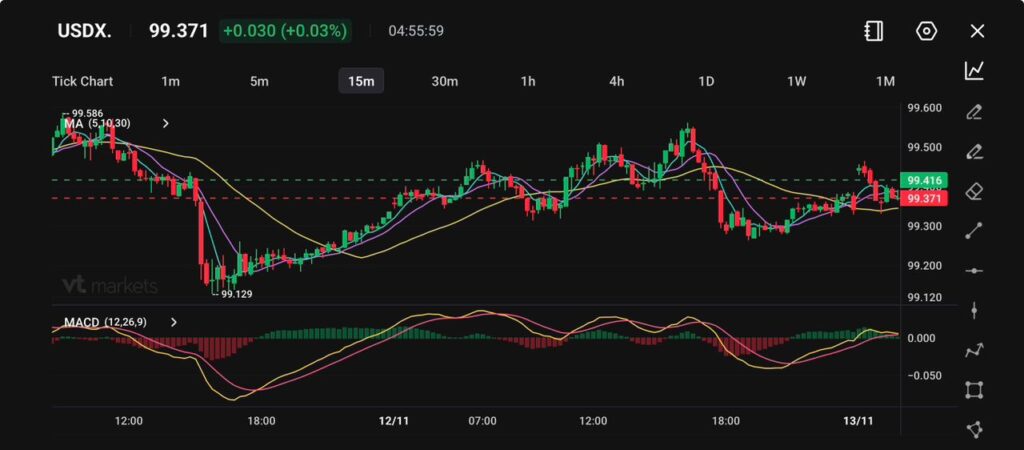 美元指數(USDX)交投於99.37附近,盤中上漲0.03%,此前曾觸及99.13的盤中低點。在15分鐘圖表上,價格走勢仍維持在99.10至99.60的區間內。