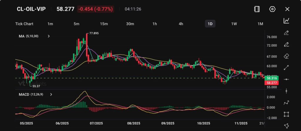 圖表顯示,WTI原油價格自7月接近78美元的高點以來一直處於整體下跌趨勢,目前穩定在58美元附近。 5日、10日和30日移動平均線收窄且走勢平緩,反映出市場動能減弱,在經歷了數月的低點後,市場開始橫盤整理。