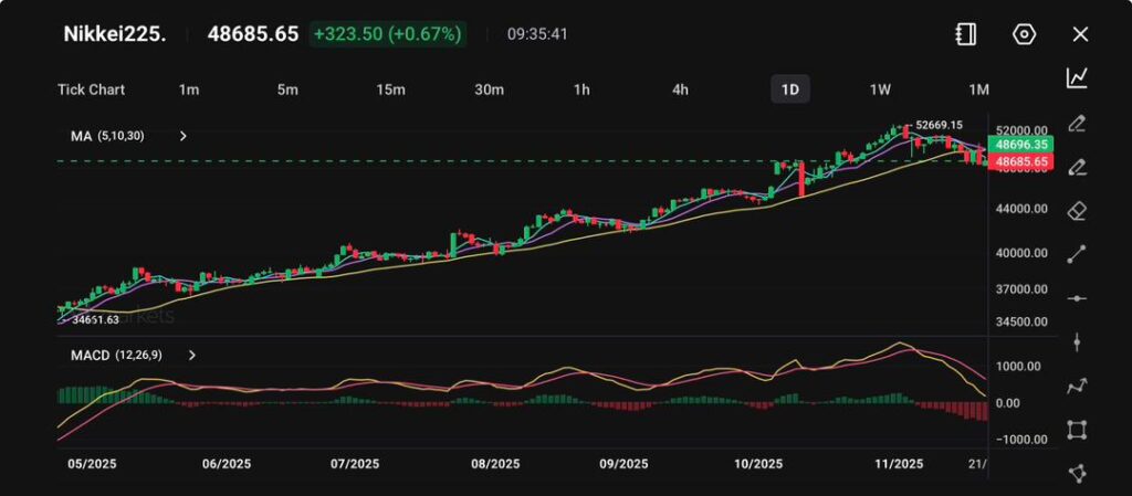 日經225指數在經歷了數月的強勁上漲後,從11月份接近52669點的高點回落,但整體趨勢仍然偏向看漲。