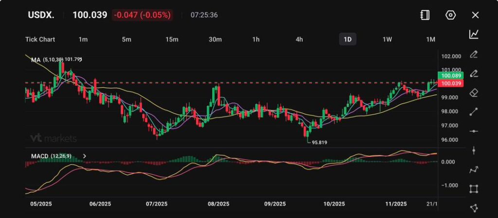 美元指數(USDX)100.15附近保持穩定,儘管市場對12月降息的預期不斷升溫,但美國公債殖利率堅挺仍為其提供了支撐。紐約聯邦儲備銀行主席約翰威廉斯暗示「近期」存在寬鬆政策的空間,這進一步強化了市場對聯準會可能很快開始降息的預期。