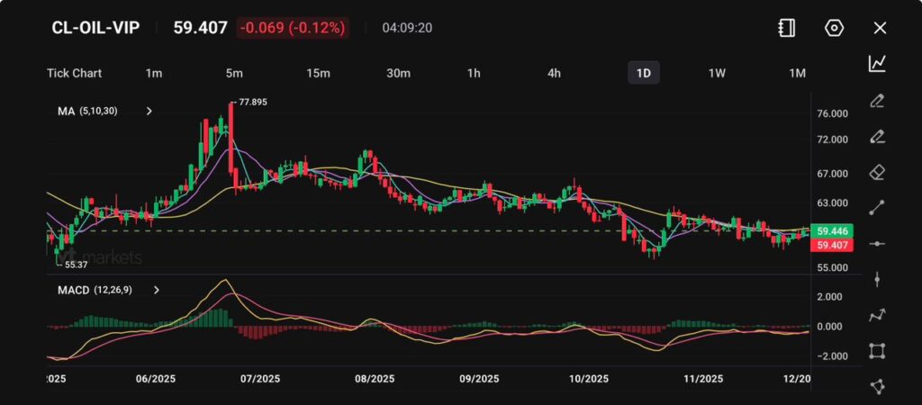 原油價格繼續在每桶 59 美元附近橫盤整理,自 7 月觸及每桶 77.89 美元的峰值以來,經歷了數月的持續走低,難以找到方向。