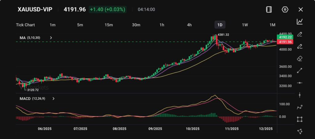 黃金價格在每盎司 4,191.96 美元附近交易,在一個略低於4,220 美元關鍵阻力位的狹窄盤整區間內保持穩定,距離近期高點4,381.32 美元也不遠。