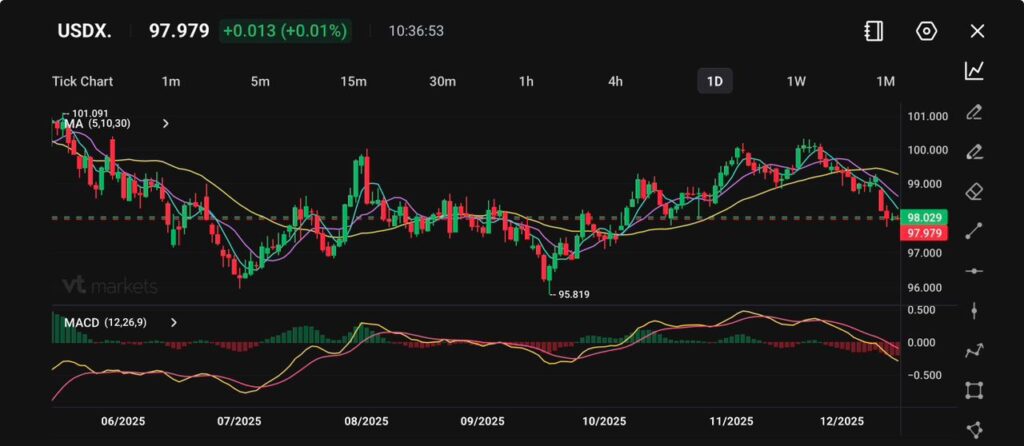 交易者應關注週線收盤價是否低於 98.00 門檻,這可能會引發 2026 年第一季加速下跌的勢頭。