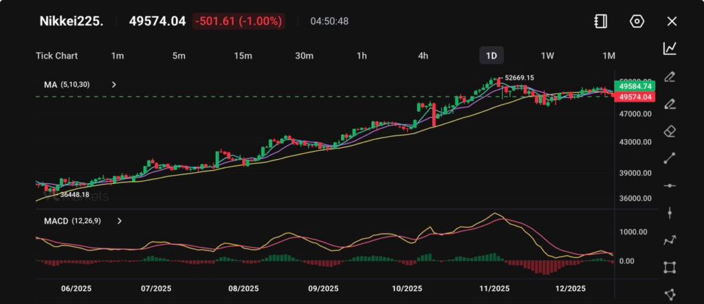 日經225指數回落至49574點,下跌超過500點(-1.00%),此前該指數經歷了數月的強勁上漲,獲利回吐和謹慎情緒令市場承壓。