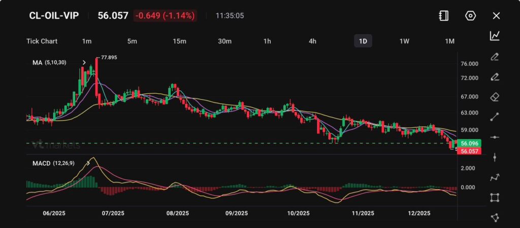 WTI原油價格持續承壓,交投於每桶56.05美元附近,日內下跌1.14%,並測試數月以來的支撐區域。自從7月觸及每桶77.89美元的高點以來,整體趨勢一直走低,價格始終未能重新站上30日移動均線。