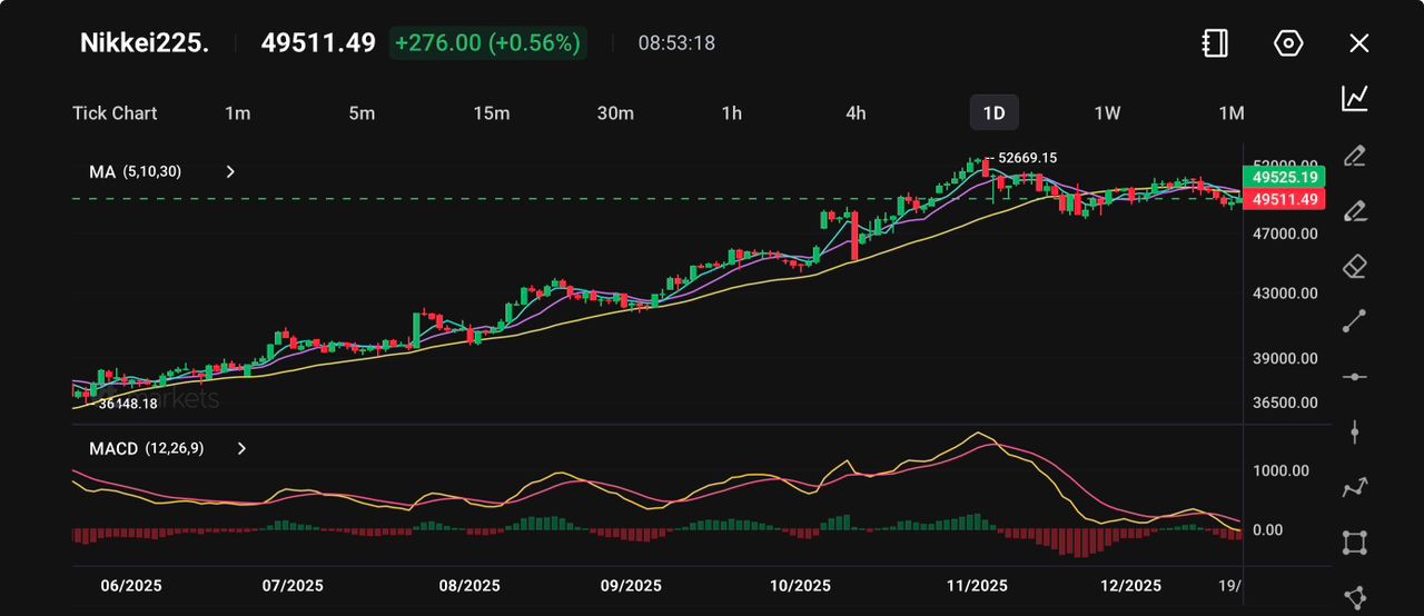 日經225指數在49511點附近盤整,當日上漲0.56%,儘管自11月觸及52669點的高點以來動能有所放緩,但仍保持整體看漲結構。