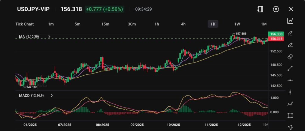 美元兌日圓匯率報156.31,日內上漲0.50%,多頭在11月下旬從157.88的高點短暫回落後,重新獲得小幅動能。
