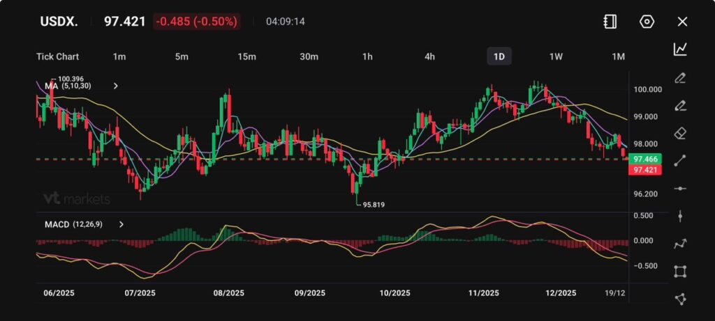 這標誌著與 11 月下旬接近100.40 的高點相比出現了顯著逆轉,當時主要是由於聯準會利率預期和市場風險偏好的變化所致。