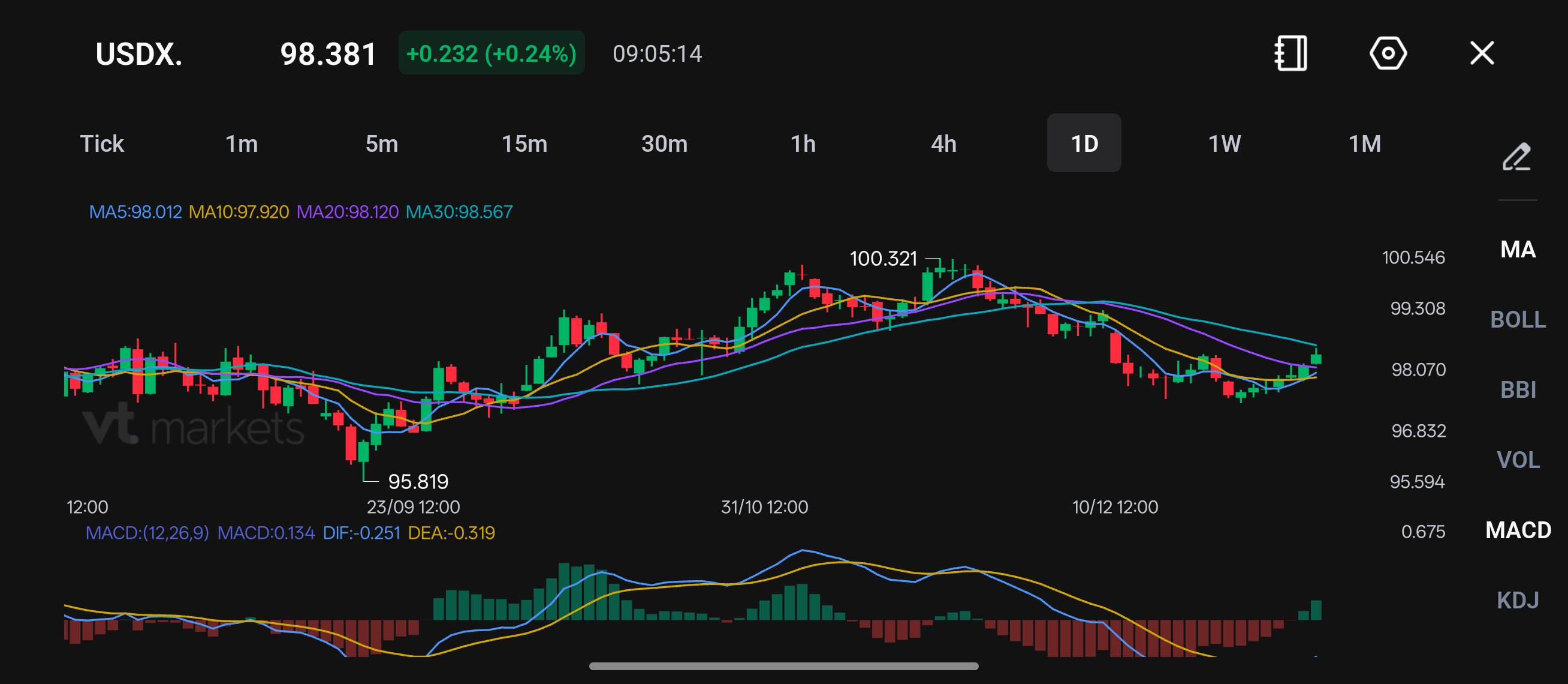 美元指數目前交易於98.00水準之上,可能會測試99.00的下一個阻力位。