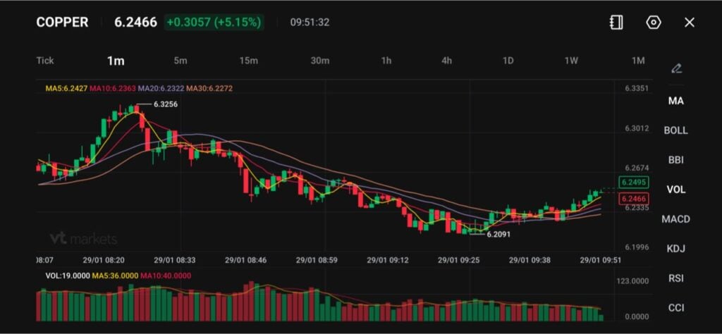 銅價飆升超過5% ,報6.2466美元,強勁的上漲勢頭推動價格從日內低點6.2091美元反彈。早盤銅價一度飆升至6.3256美元的高位,隨後進入回檔階段,但在交易時段中期穩步回升。