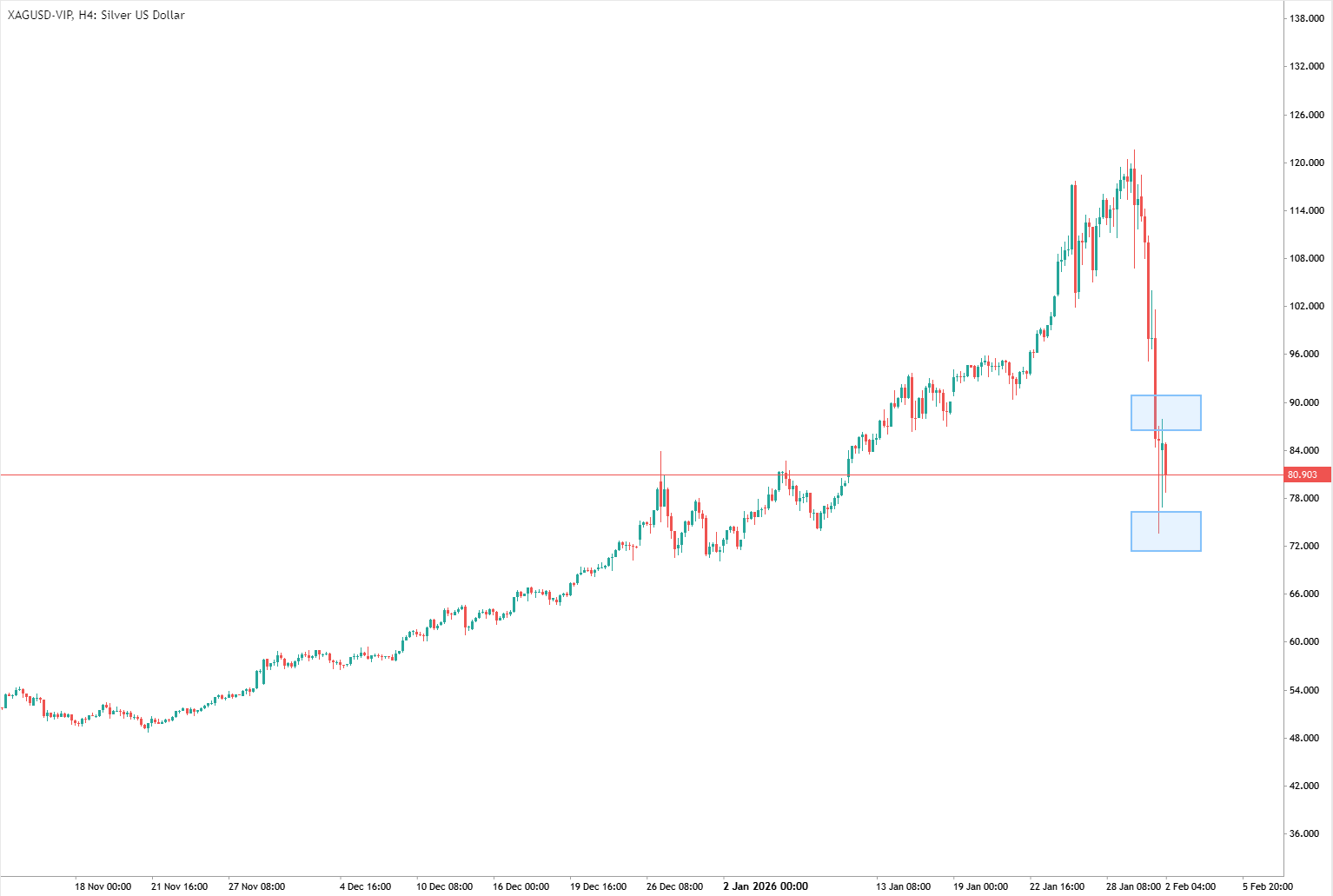 - 白銀價格可能開始在 86.8 阻力位和 74 支撐位之間盤整。