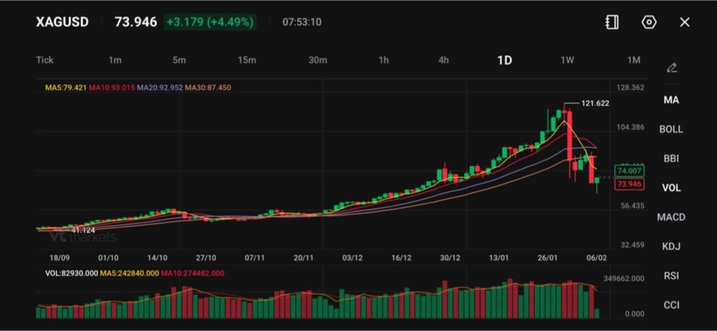 白銀 (XAGUSD)在今日交易中大幅反彈,上漲4.49%至73.946 美元。此前,白銀在 2 月初經歷了動盪,短短幾個交易日內,價格就從121.622 美元的高點暴跌至接近70 美元。