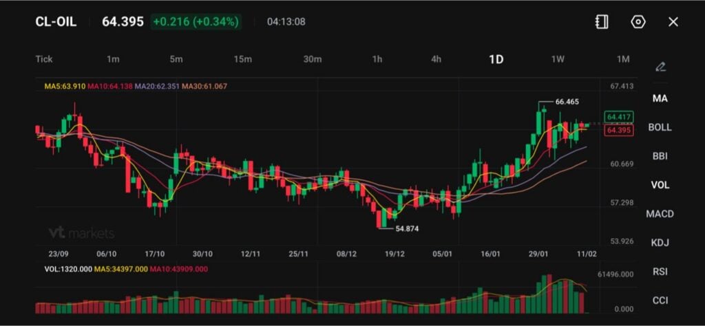 原油(CL-OIL)目前交易價格為每桶64.395 美元,上漲0.216 美元(+0.34%),延續了自 12 月中旬創下的近期低點54.874 美元以來的穩步上漲勢頭。