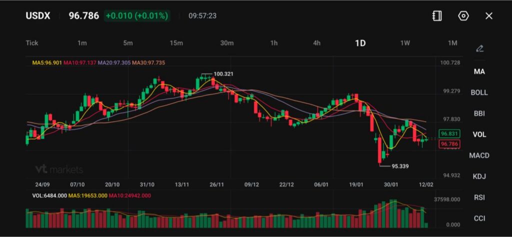 美元指數(USDX)目前在96.786附近交易,與前一交易日相比變化甚微(+0.010 / +0.01%),反映出市場在經歷了上週的波動後處於觀望狀態。