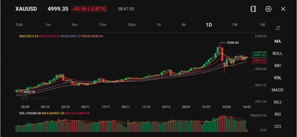 此前金價在觸及5,598.60 美元的高點後受阻,目前正回落至 5,000 美元的心理關口附近。
