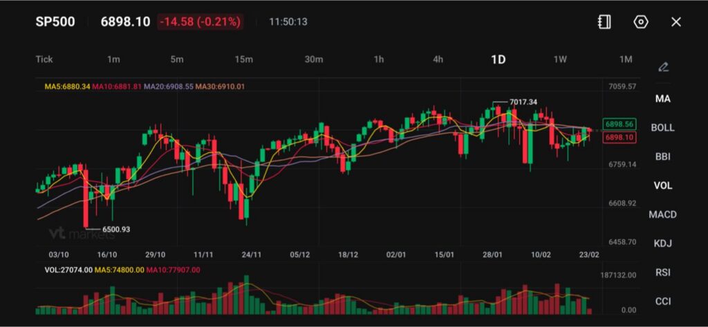 標普 500 指數在6,898 點附近交易,當日下跌約0.2%,該指數在近期高點7,017 點下方盤整。