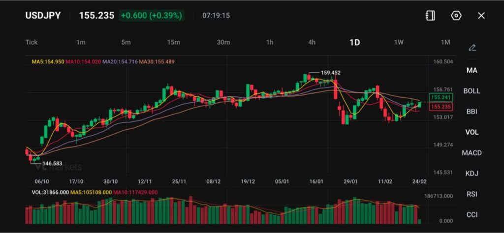 美元兌日圓匯率在155.24附近交易,當日上漲約 0.4%,此前該貨幣對從159.45的高點回落,目前正試圖企穩。