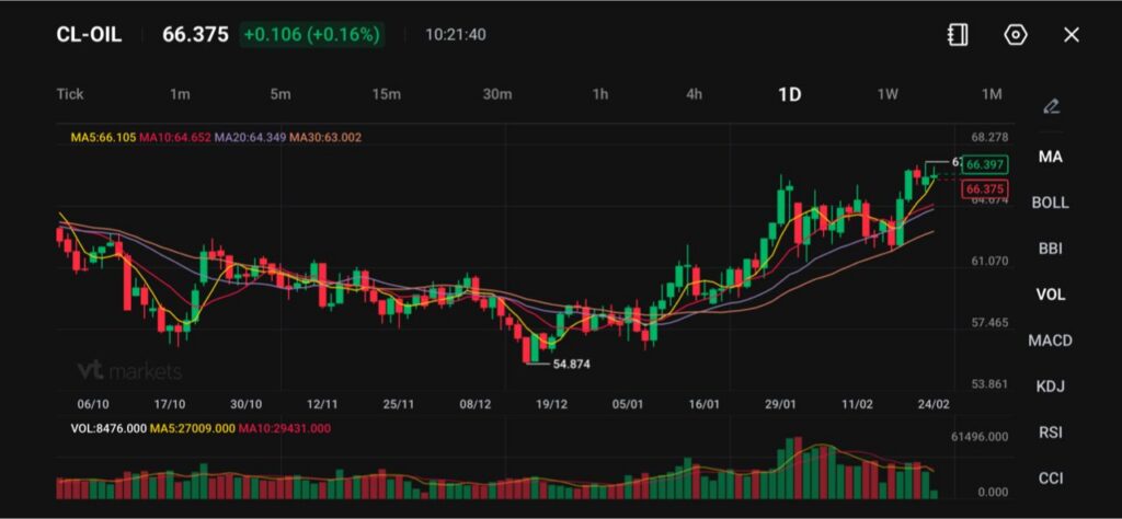 原油(CL)交易價格接近66.38 美元,盤中小幅上漲,市場繼續從 1 月的低點54.87 美元回升。