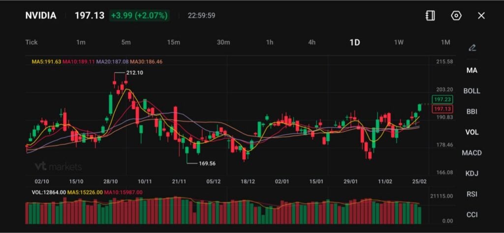 從技術面來看,英偉達股價仍高於其短期和中期移動平均線,目前交易價格接近 197 美元。然而,它仍低於 212.10 美元的歷史高點。如果股價能夠持續突破 203 美元,則可能預示著上漲勢頭將重燃。