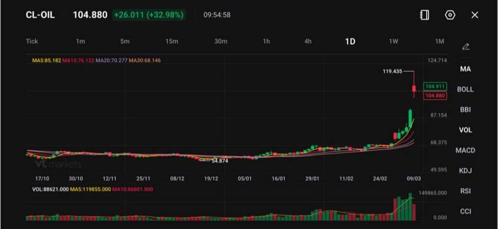 WTI 原油(CL-OIL,常見的交易代碼)大幅飆升至104.88 美元附近,單日上漲+32.98%。這波暴漲由 80 多美元區間強勢突破後引爆,價格一度衝到119.43 美元附近,之後小幅回落。