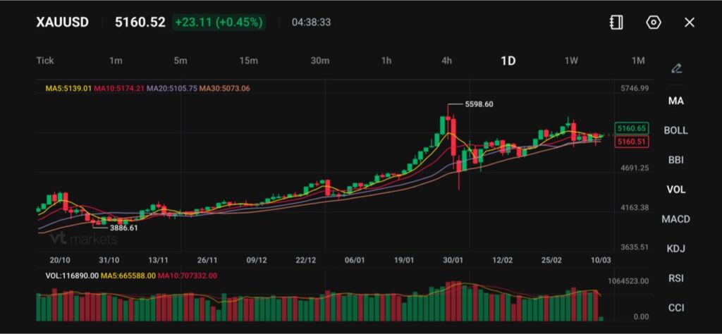 - XAUUSD(黃金兌美元)報 5160.52,上漲 +23.11(+0.45%);MA5 5139.01、MA10 5174.21、MA20 5105.75、MA30 5073.06(MA=移動平均線,用一段時間的平均價格看趨勢)。
