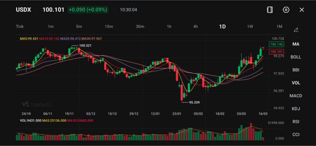 美元指數(USDX)幾乎持平在100.342,此前週五一度升至100.54。美元指數是衡量美元對一籃子主要貨幣(例如歐元、日圓等)強弱的指標。地緣政治風險與能源價格偏高,讓市場持續出現避險需求。