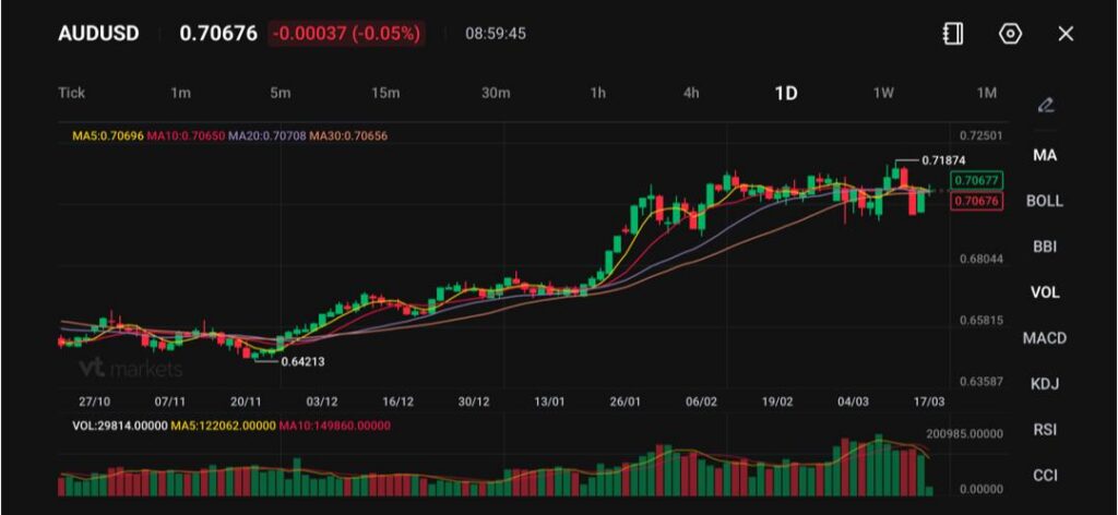 AUDUSD 走向 0.7088,在前一個交易日大漲後續升;交易者重新評估 RBA 最新決策後的利率走勢。(交易者:參與買賣的投資人)