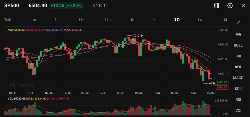 S&P 500(SP500)目前約在 6505 附近交易,前波急跌把價格打到約 6439 的低點後,正在小幅反彈。整體走勢已從先前的區間盤整轉為明顯的短線下跌趨勢;這波反彈目前看起來像修正(跌後回拉),而不是新的強勢上漲。