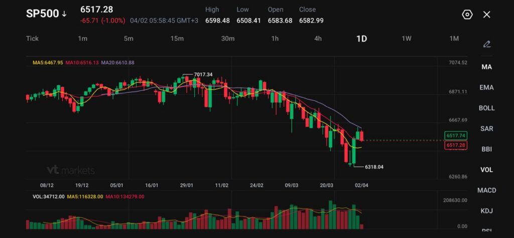標普 500 目前在 6517 附近交易,先前急跌至6318低點後,正嘗試小幅反彈。整體型態仍偏弱,因為價格先前在 7017 高點附近受阻回落,至今仍難以恢復上漲動能。近期K線顯示短線反彈,但力道不強,較像是回升修正,未必是趨勢反轉。K線:用開盤、收盤、最高、最低價畫出的圖形。修正:下跌後的短暫反彈(或上漲後的回落)。反轉:趨勢方向改變。
