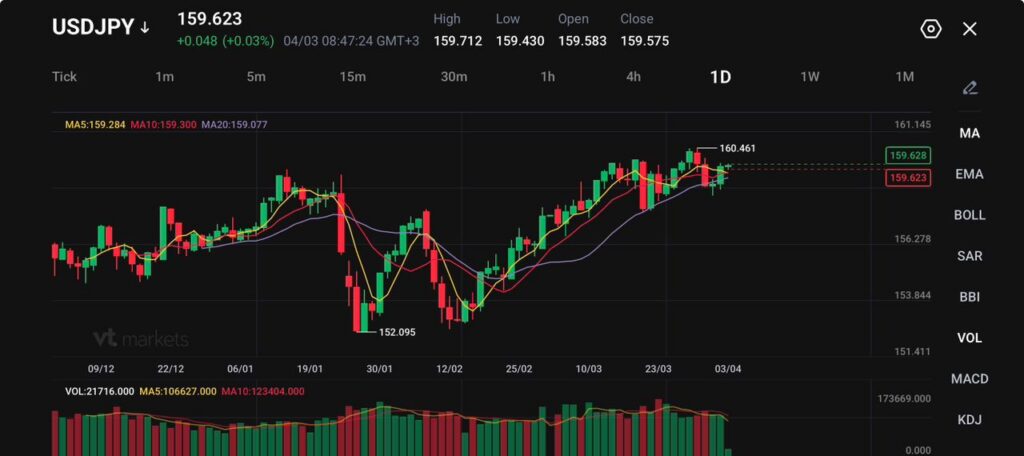 因為油價偏強、地緣政治風險仍在、且日本央行尚未給出足夠明確的政策訊號時,市場仍偏好美元。圖表顯示美元兌日圓在 159.623,仍接近近期高點 160.461。