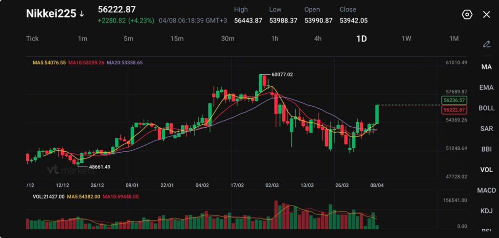 停火消息降低了波斯灣能源運輸(原油與天然氣運送)的短期風險,交易者(做短線買賣的人)重新買進較高風險資產(如股票),帶動日本股市大漲。日經225指數早盤上漲4.96%,報56,078.83;圖表讀數來到56,222.87,顯示反彈力道強。