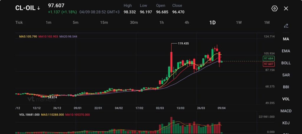 • CL-OIL 現報 97.607,上漲 1.137(+1.18%);盤中高點 98.332、低點 96.197。(CL-OIL:常用來指美國西德州中質原油 WTI 的期貨/差價合約報價)